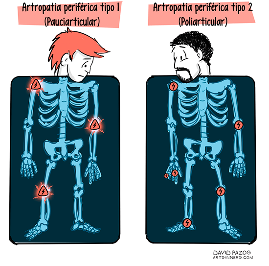 Aunque la artritis se puede presentar de múltiples formas, existen dos tipos de artritis periférica bien definidos en función de su localización y evolución (Tabla): la Artritis Periférica Tipo 1 o Pauciarticular y la Artritis Periférica Tipo 2 o Poliarticular.